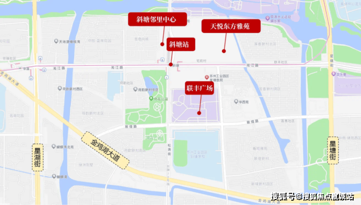 背依斜塘老街时尚街区,紧邻邻里中心,向东约1km(一站地铁)奥体中心,向西约1.5km邻瑞广场山姆超市、向北约2.5km圆融时代广场、久光百货、IFS苏州国际金融中心。沿中新大道与金鸡湖隧道直达苏州中心。