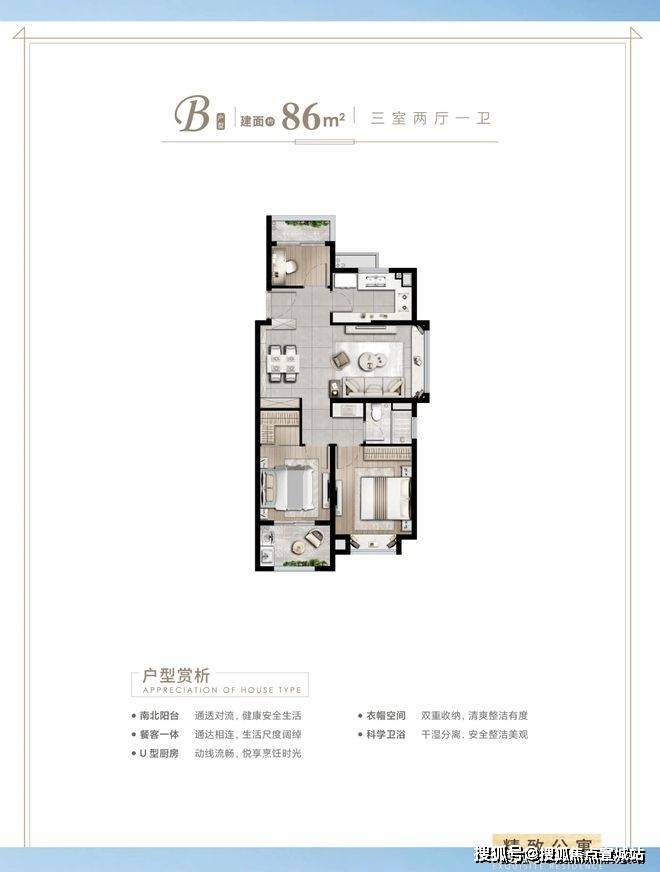 建面约86㎡3房2厅1卫户型特点:做到了双开间朝南+双阳台设计+卫生间干湿分离,一个非常紧凑的小3房户型。