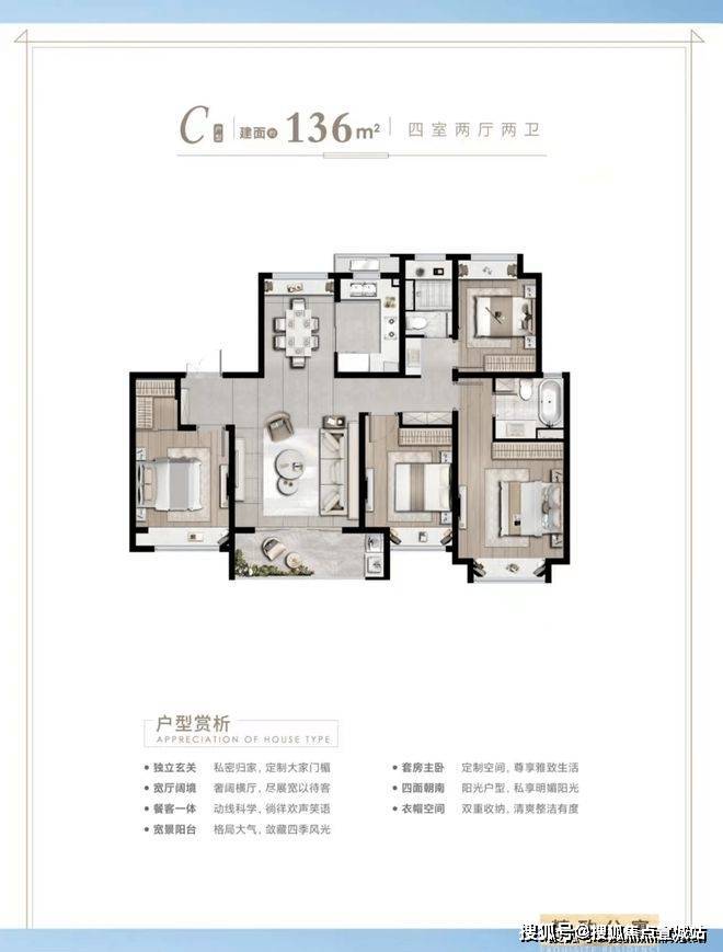 建面约136㎡4房2厅2卫户型特点:做到了四开间朝南+全卧飘窗+主卧套房设计+南北通透+客卫干湿分离,一步到位的改善型大4房。