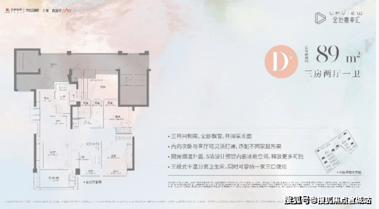 建面约89㎡三房两厅一卫(D户型),不仅功能完备,而且很好地把控了总价,约350万起即可上车高配品质三房,堪比市场上110平左右的空间感!