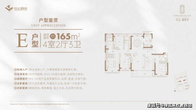 以建面约165㎡奢境户型为例,南向四开间面宽可达约16.2m,约6.2米宽厅连接宽幕阳台;