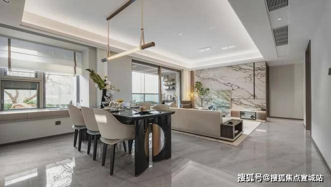 客餐厅阳台一体设计,客厅南连宽景阳台,餐厅南连飘窗,整个公区视野开阔尺度阔绰,足以彰显业主的非凡气度.