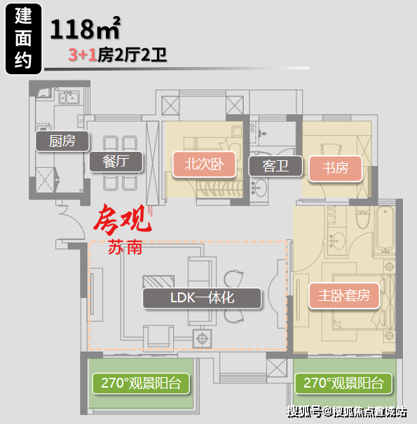 约118㎡户型整个户型LDK一体化开间 约6.6m,可作为 大3房, 双阳台拐角270°采光,也可作为 功能性4房使用,