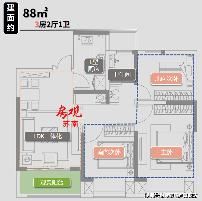 浅隐林泉售楼处电话:400-8851-337项目约88㎡户型,整个户型都采用LDK一体化设计, 大横厅+餐厅“洄游动线”的设计,解决了传统户型的过道浪费和进深短问题,大大提高了面积利用。