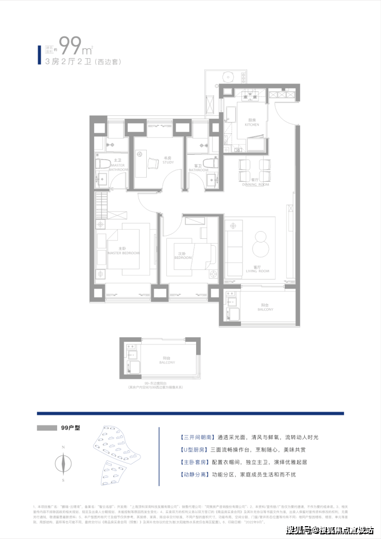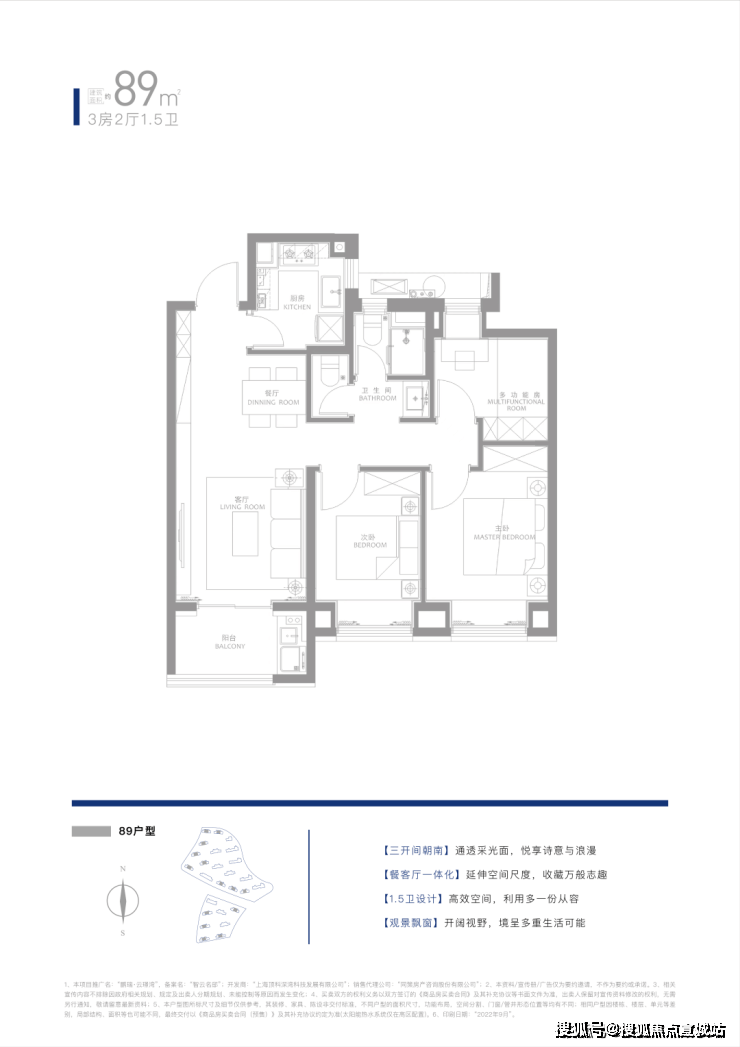 约89㎡三房两厅一卫:1.5卫设计为临港首创,南北通透,主卧套房设计,独立玄关与U型厨房提升实用性。