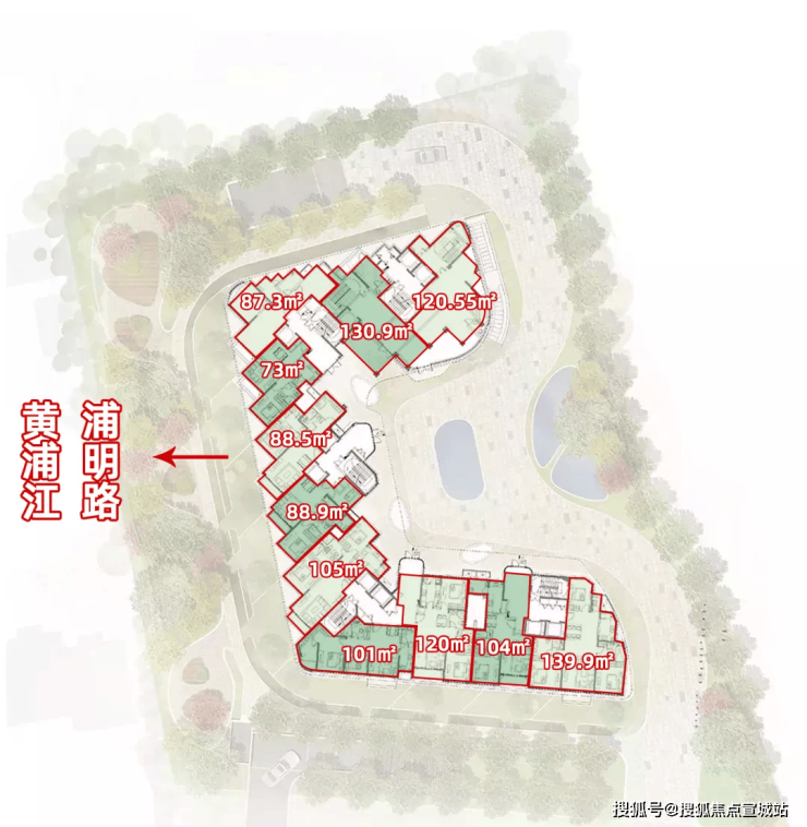 为了看到更多的黄浦江景,整个楼栋呈U字型布局,南北西三面为主要朝向,南侧单元朝南偏西45度,北侧单元南偏东45度。