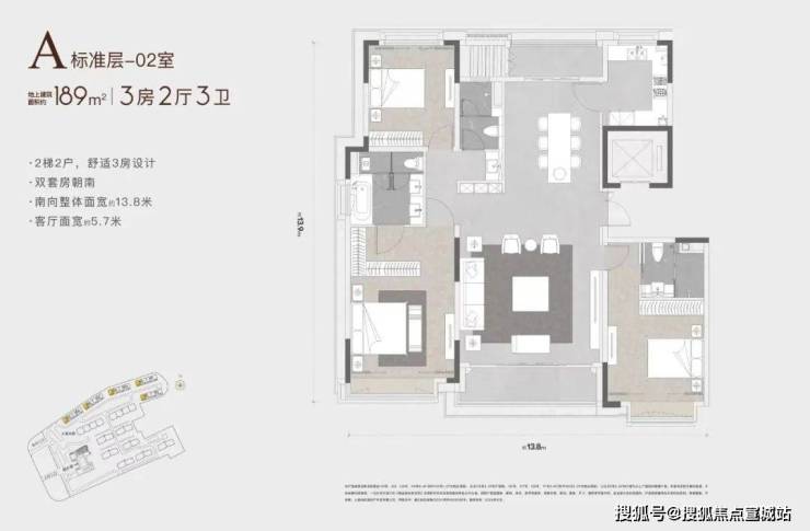 平层产品(A户型):地上建筑面积约158-198m²,两梯两户,舒适三房,双套房朝南,南向园林景观,北向体育公园,生活在四季的中央。