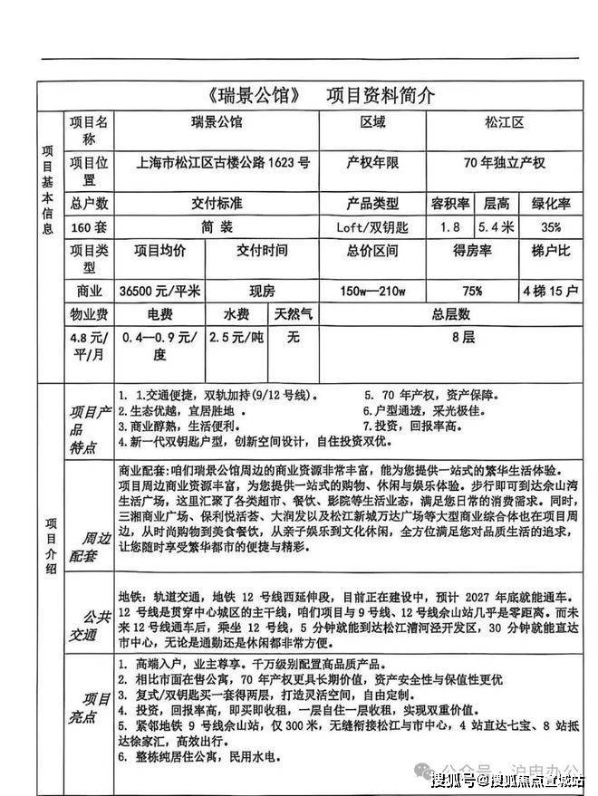 【瑞景公馆】产品信息:9号线→佘山地铁站建面:60㎡~68㎡总价:180万~210万卖点:1️⃣9号线旁|3⃣大TOD加持2️⃣70产权稀缺地段3️⃣5.4米loft/双钥匙下楼即地铁4️⃣买一层得二层现房交付5️⃣南北通透得房率高达150%6️⃣自用投资首选不限购不限贷