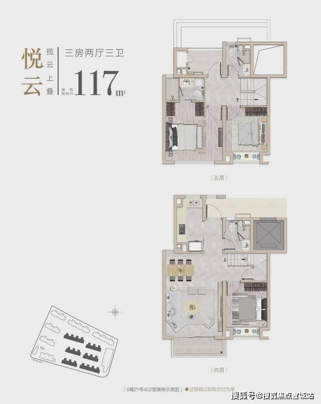 产品方面,项目以现代中式风格为基底,凝萃平坡结合手法,融入顶部挑檐及坡顶设计,全心呈现建面约117-129㎡中式叠墅、建面约85-95㎡逸境洋房洞见大匠修为。