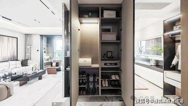 入户后,玄关柜也是交付标准,不仅配备了“除臭精灵”,下方更预留了扫地机器人的空间,整个精装不仅是单纯的大牌堆砌,更体现了“拎包入住”的实用性。