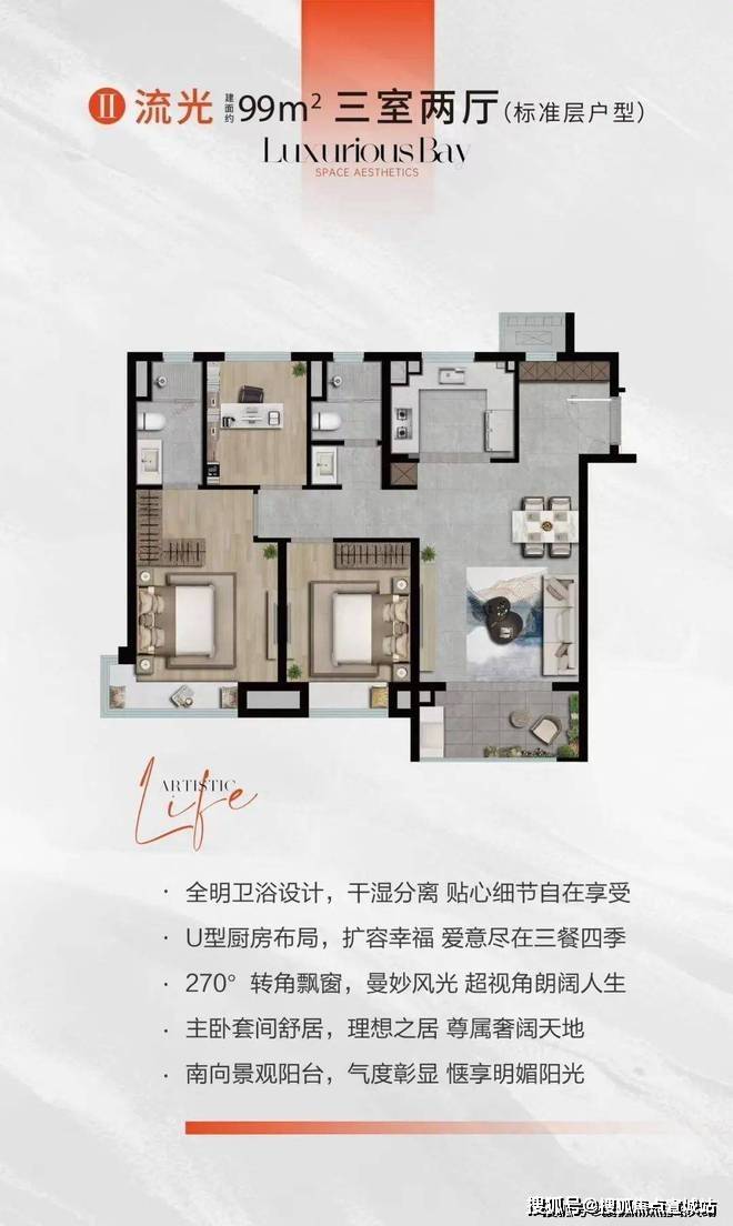 以7.6m大横厅,深U型厨房以及奢阔休闲阳台,彰显高阶气度与格局,独立入户的设计互不打扰,静享私密,南向大横厅,让阳光、风景与生活常伴。再次以奢阔美学艺术生活,敬献金山大人物。