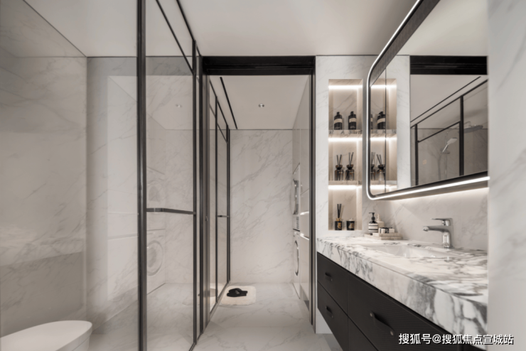 ✔卫生间地面和墙面整体性也非常强,奢石台面的纹路和岩板墙面和协调。
