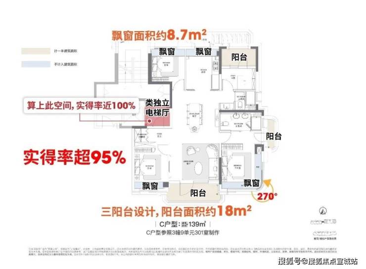 建面约139㎡C户型同样惊艳,采用三阳台设计,阳台面积约18㎡,飘窗面积约8.7㎡,实得面积约133㎡,实得率同样突破95%。