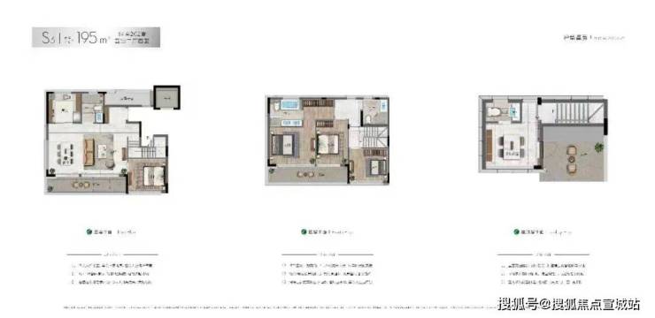 上叠:以195㎡的五房四卫,除了二层规划了朝北露台外,三层的空中阁楼,从多功能空间推门而出,竟然是一个“270°环幕式”生活露台,面积有70㎡左右.它可以是你抽离纷杂尘世的秘密花园,也可以是朋友聚会的快乐之地.▲建面约195㎡的上叠户型图