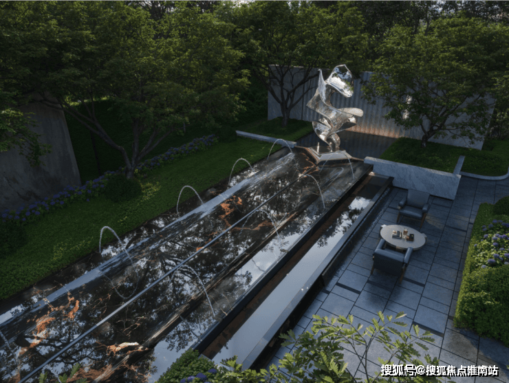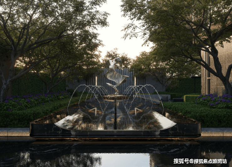 前场花园以兰特庄园为设计灵感,明确的中央轴线贯穿,中心喷泉顶端放置了应晶晶的山海金阙,以秩序中的自然理念通过几何布局、水景艺术和人文符号加功能美学与哲学融为一体。