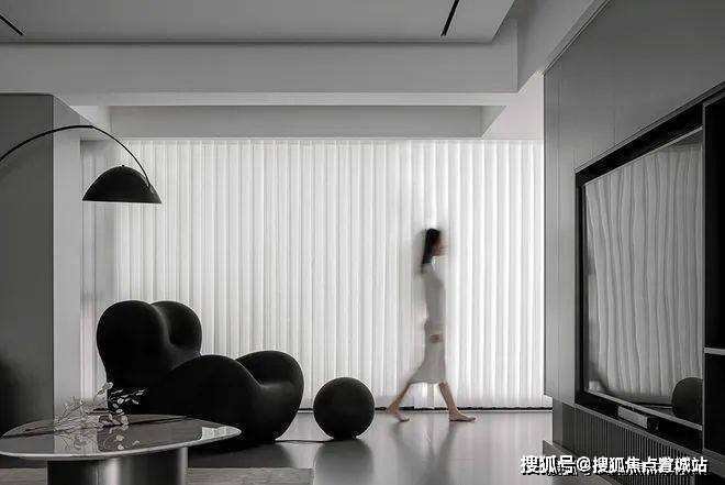 空间布局重新打造,传统设计的隔断被拆除,通透感中,各区域联系更紧密。黑色沙发奇特的造型带来动感和时尚元素,沙发上有凸起设计,提高支撑感,让居者小憩时更加舒适,体会时光温柔。