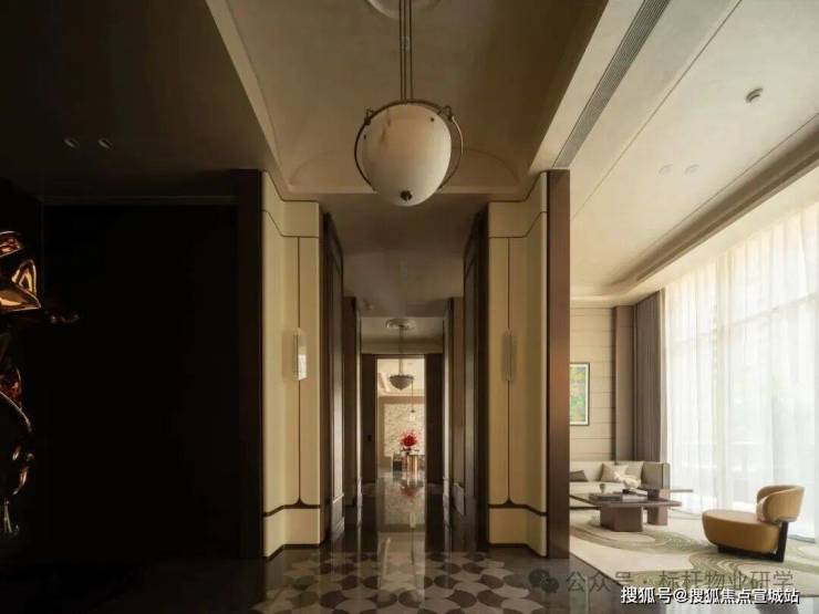 其创新性在入口处展现得淋漓尽致:常规沿街楼栋通常直接由物业用房过渡至住宅二层,但该项目在物业用房上方特别增设了架空层,形成"物业用房-架空层-住宅二层"的独特空间序列。这一设计突破性地通过地面整体抬升,不仅解放了沿街楼栋原本受限的架空层空间,更创造出尺度恢弘的入户大堂,使归家动线在垂直维度上获得仪式感的升华。