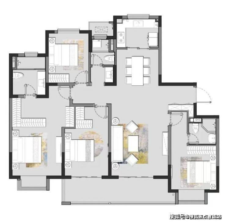 主打三房 / 四房改善户型,户型方正、南北通透,多飘窗 / 阳台赠送,适配刚需改善、三代同堂需求: