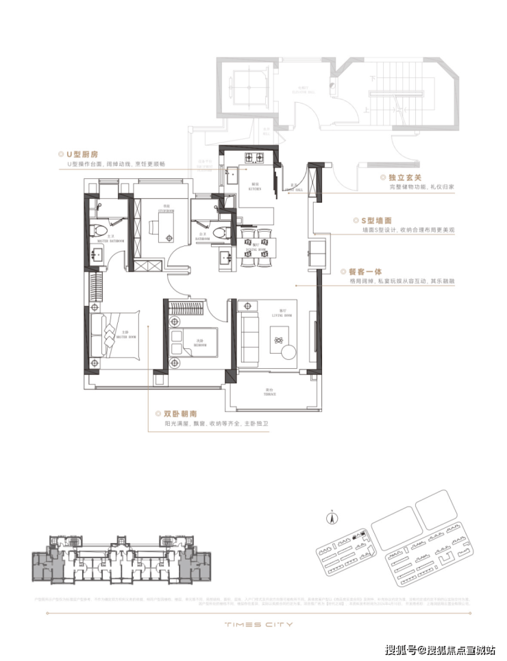 高层户型:建面约 92-135㎡,有三房和四房户型。以建面约 110㎡的三房两厅两卫为例,户型方正,南北通透,南向双阳台,厨房超大柜体收纳,玄关采用 S 墙设计,主卫有美妆冰箱等。