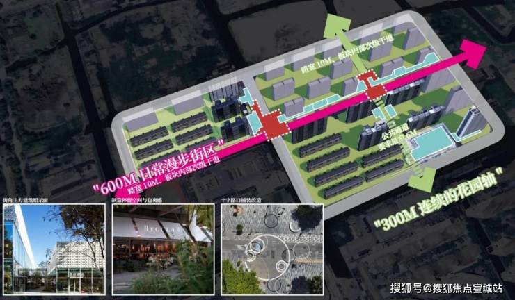 这些丰富的生活场景,则由两条景观轴线串联:一条是约300米的连续花园轴;一条是约600米的日常漫步街区。