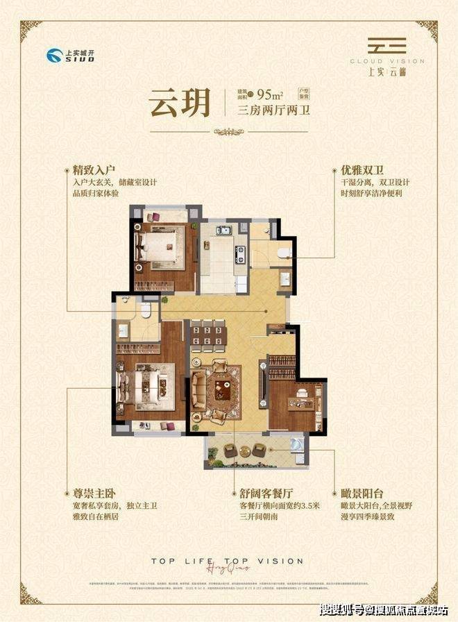 做到了三开间朝南+瞰景大阳台+主卧套房设计+南北通透+卫生间干湿分离,该户型得房率和空间利用率都非常高。