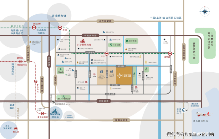 医疗与生态配套:3 公里内有浦东新区人民医院,20 分钟可达上海中医药大学附属曙光医院;与 12 万方城市公园一路之隔,周边还环绕川沙公园、迪士尼星愿公园,日常休闲便捷。