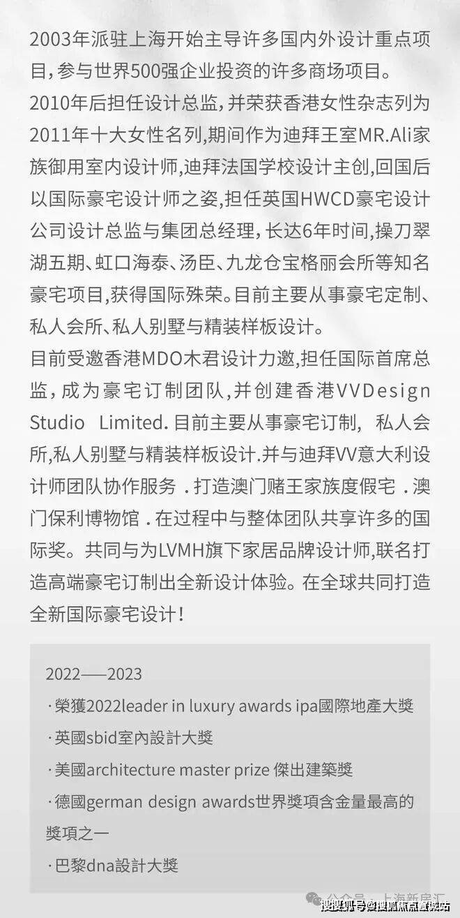建筑设计:由WDesignStudioLimited设计,外立面采用干挂石材,法式精装交付,配备中央空调、地暖、新风系统。