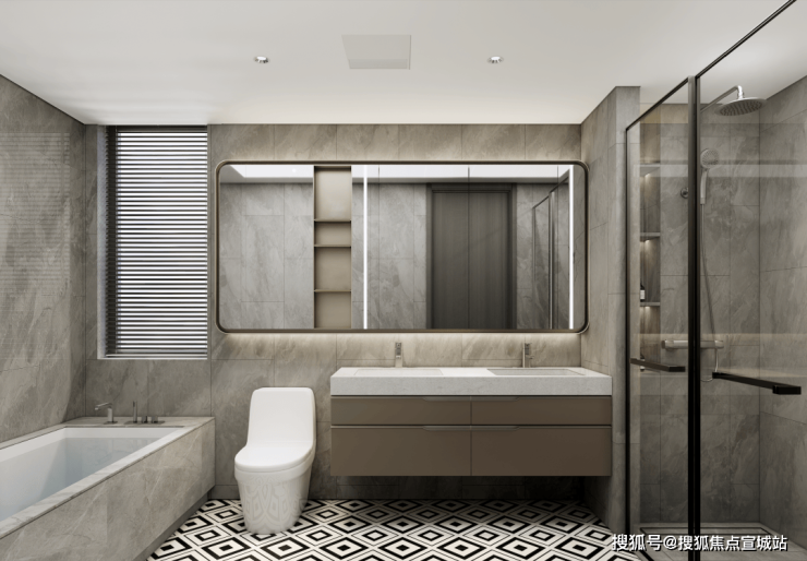 卫生间里的弧形镜、地面拼花、金属复古移门...各个空间都呈现出细节的精致感。