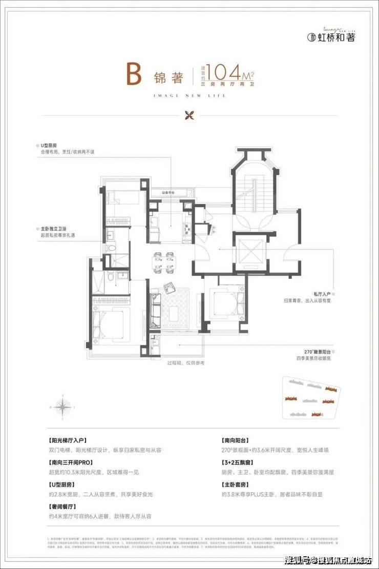 建面约104㎡3房,在建面94㎡小3房优点上,又进一步升级了尺度感,约10.3m的南向面宽,为室内带来了出众的采光面和尺度感,这个户型无论从实用性、尺度感,亦或是视野、采光、私密性来说,都做得相当优秀。