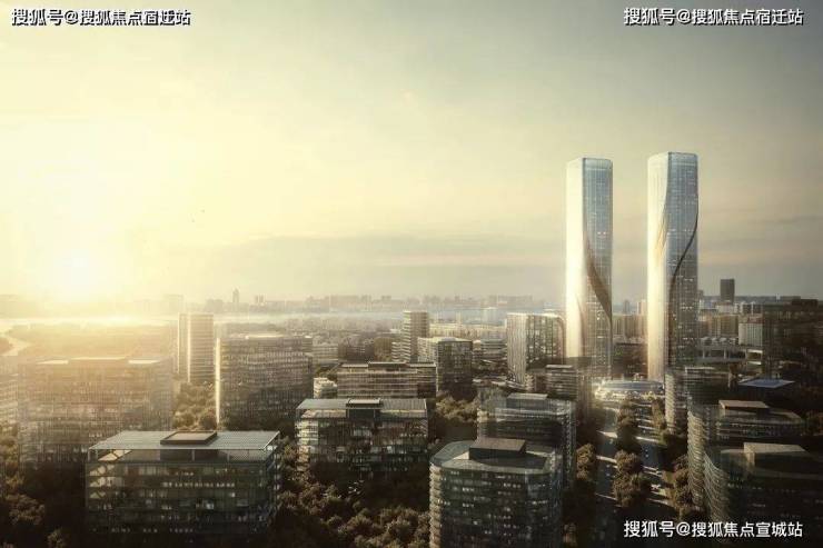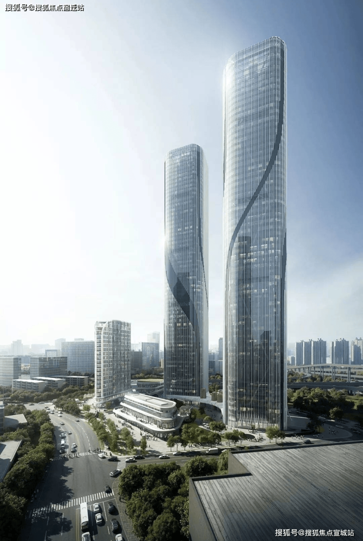 塔楼外立面以抽象的曲线模式展现出钱塘江的灵动。设计团队还对双塔的表皮进行了竖向线条的处理,包裹上超白玻璃幕墙,创造出动态的外立面效果。建筑造型简约内敛,表皮随着光线的折射而呈现出极具流动性的线型变化,呈现钱塘江潮汐的涌动与起落,形成丰富的立面韵律,仿佛是一组节律变幻的城市音符,反映出该地区“钱江潮涌”的奇特潮汐现象。