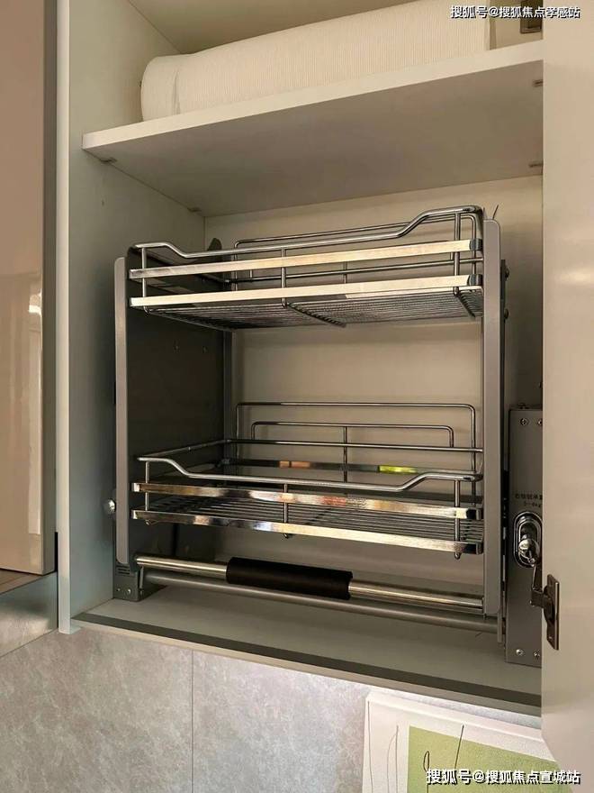 橱柜作为强功能性的收纳系统,自然少不了操作性能上的考究,吊柜做了升降式的拉篮,以后再也不用爬上高凳拿取了。