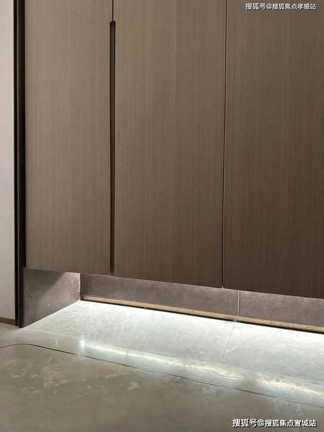 鞋柜下方做了悬浮处理,同样也是内嵌灯带,这里灯光的角度还会再调整,因为灯光映射在大理石地面上,要显得尽量柔和不刺眼;同时,鞋柜下方可放拖鞋,还能放扫地机器人,便于日常清扫打理。