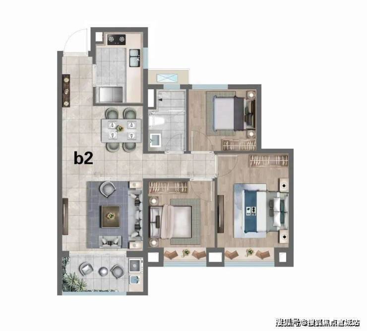 建面约91㎡三房两厅一卫,三开间朝南+双朝南卧室带飘窗+动静分离,是一个采光面十足的小3房户型。