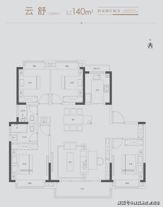 方正格局:全明阔绰四室、约13.4M南向四开间,打造尊荣生活格局