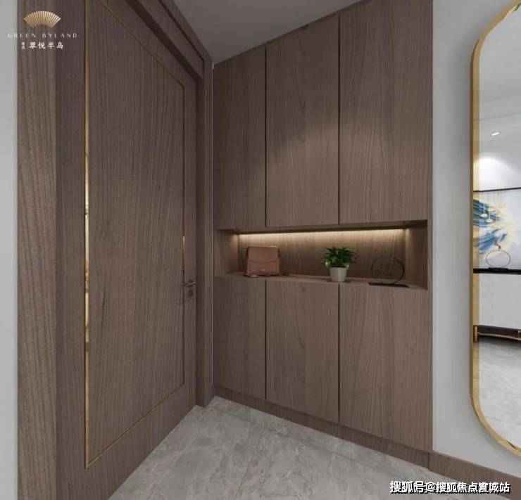 而入户玄关柜,采用了三段式玄关柜设计,上中下各设收纳分区,保持了整个空间私密性的同时,在空间使用率上又做到了合理分配.上层收纳区可用于收纳使用频率不高的家居或换季鞋服;中层物件区悬空并设置了内打灯,可摆放观赏性摆件/家庭相簿、钥匙等小物件,温馨十足;下层常用区可收纳常用鞋、拖鞋等,空间大,可满足全家鞋子收纳需求.