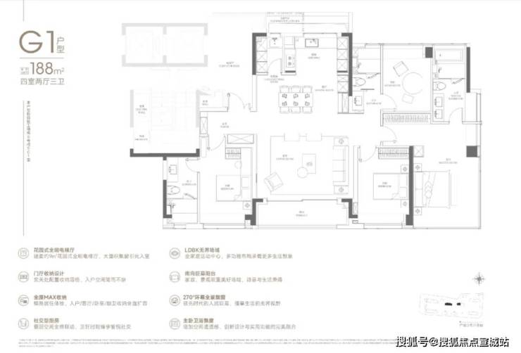 188户型2梯2户,有独立的电梯厅。4房3卫设计,还是3明卫,这两点还是不错的。