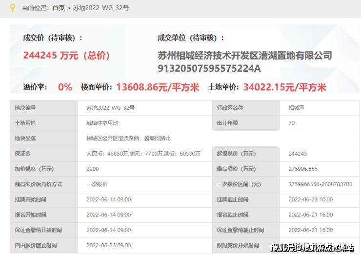 龙湖·峯云境,即苏地2022-WG-32号地块项目,位于相城区经开区澄波路西、蠡塘河路北,是2022年6月23日,漕湖置地以底价244245万元竞得,成交楼面价13609元/平。