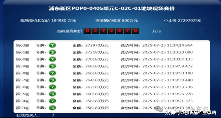 7月25日,2025年上海六批次土拍中,浦东新区PDP0-0405单元C-02C-01地块吸引了7家房企参与竞拍.经过62轮激烈竞价,该地块以40%的溢价率封顶,并进入竞高品质环节.
