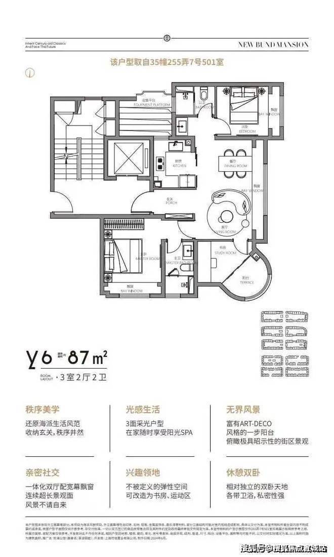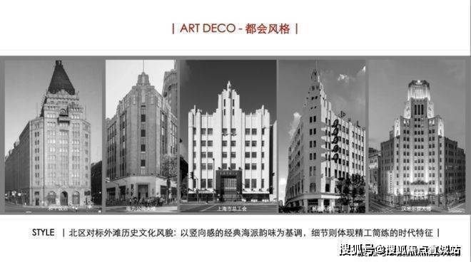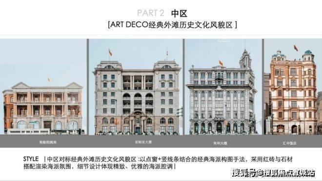 北中南区分别采用浓郁河畔风情的外滩晚期历史文化风貌、古典厚重的外滩早期历史文化风貌与优雅低密的Art-Deco摩登艺术风格。日常归家,邂逅外滩百年建筑变迁史。