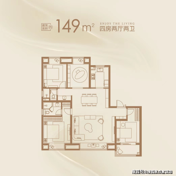 149㎡四室两厅两卫:分布于12#楼,2梯2户设计,总价300-350万。采用LDK一体化设计,南向面宽6.2米,主卧配备L型衣帽间,得房率高达85%