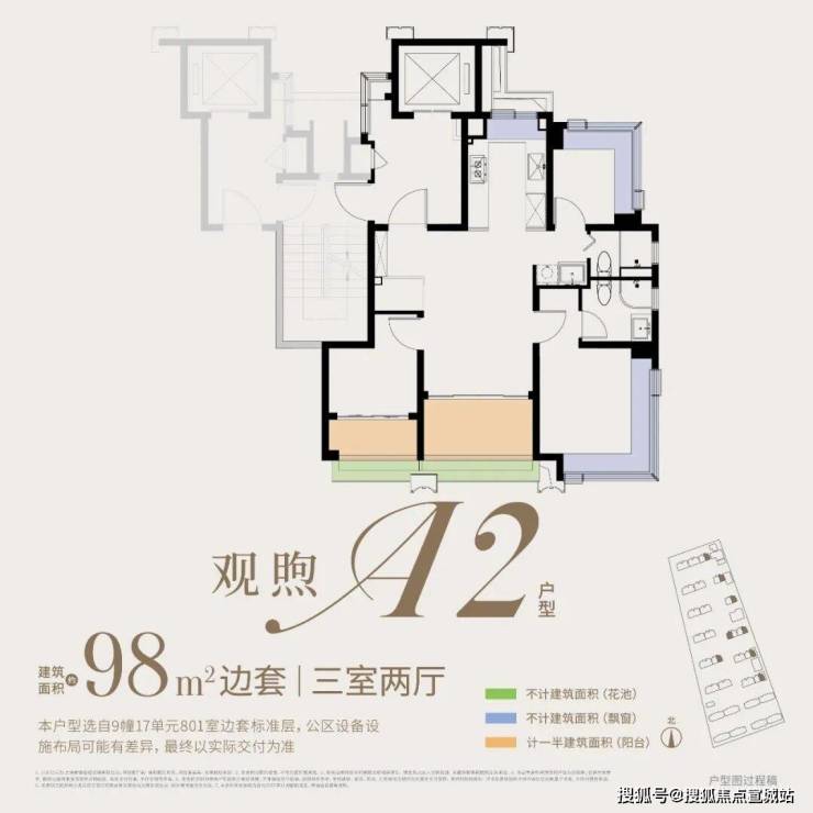 约98㎡3房:类一梯一户、全屋飘窗为标配,双阳台+花池是核心亮点(市面双阳台户型起步多为约110㎡),整体附赠约23㎡,是罕见的高实得率精致户型。