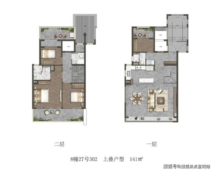 以建面约141㎡上叠户型为例:格局与下叠基本相同,约7.2米的横厅,客厅局部挑空。北向的储藏室附带阳台(阳台可打通,改造成北向房间),二层则拥有南北双露台。