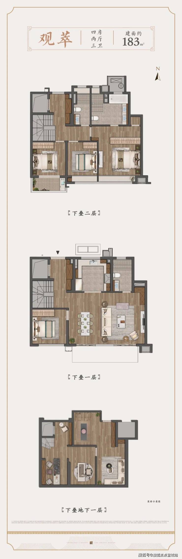 下叠餐客厅连通,空间开阔。动静分离,主卧带小阳台,步入式衣帽间。次卧私密性良好。3卫设计使用方便,且布局合理。