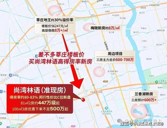 要知道,闵行中部房价早已站稳“8”字头,莘庄地王楼板价更是飙到56247元/㎡,未来售价妥妥8万+/㎡——这意味着,尚湾林语的买房价,几乎等同于莘庄地王的楼板价。