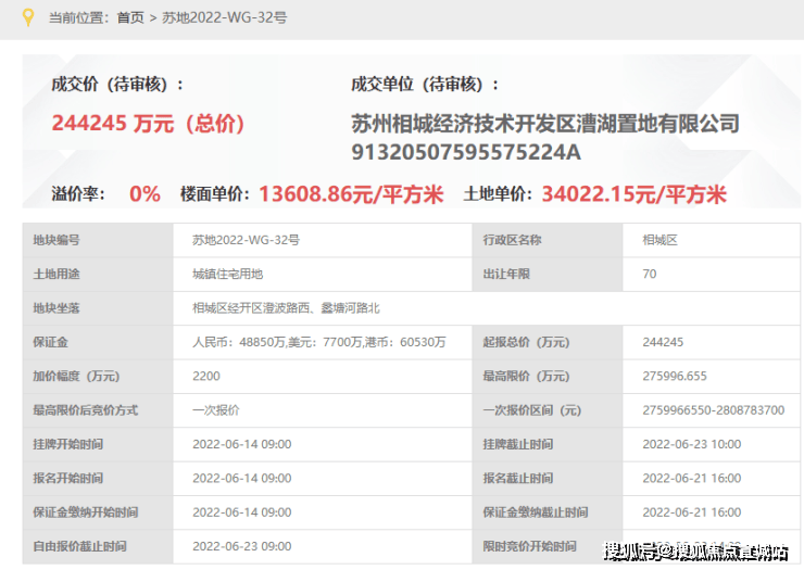 龙湖·峯云境,即苏地2022-WG-32号地块项目,位于相城区经开区澄波路西、蠡塘河路北,是2022年6月23日,漕湖置地以底价244245万元竞得,成交楼面价13609元/平。