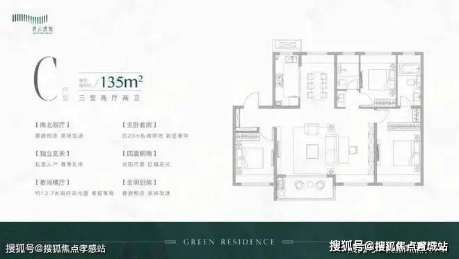 此户型可以说是改善人群非常喜欢的户型,建面约135㎡3房2厅2卫设计,动静分区,四开间朝南,各空间尺度奢阔,还有一个超大面宽的景观阳台,实现功能性和舒适度兼得。
