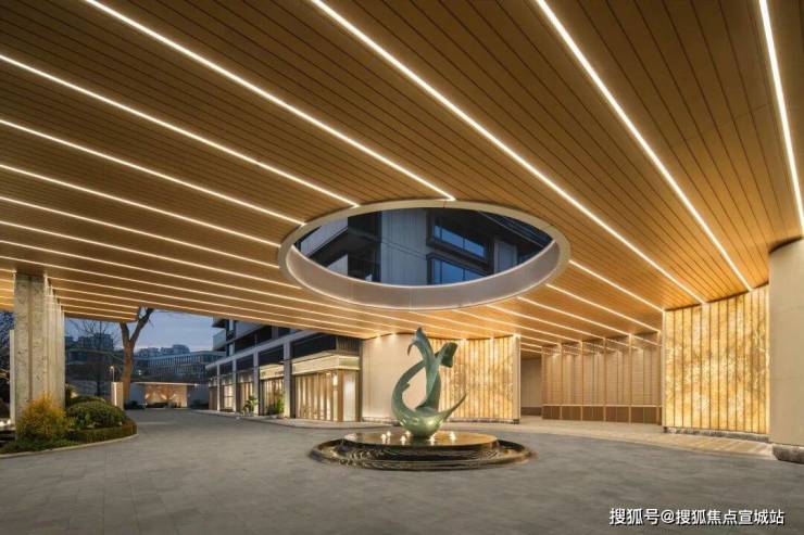 第一眼便是目前大宅新盘同款的奢阔大门,望宸映澜不仅尺度宽阔大气,伸出的酒店式迎宾门头深深向外挑出,其后环岛落客区中间一组雕塑叠水与背后的透光奢石景墙形成对照,像极了奢华的酒店落客大堂,将仪式感直接拉满。