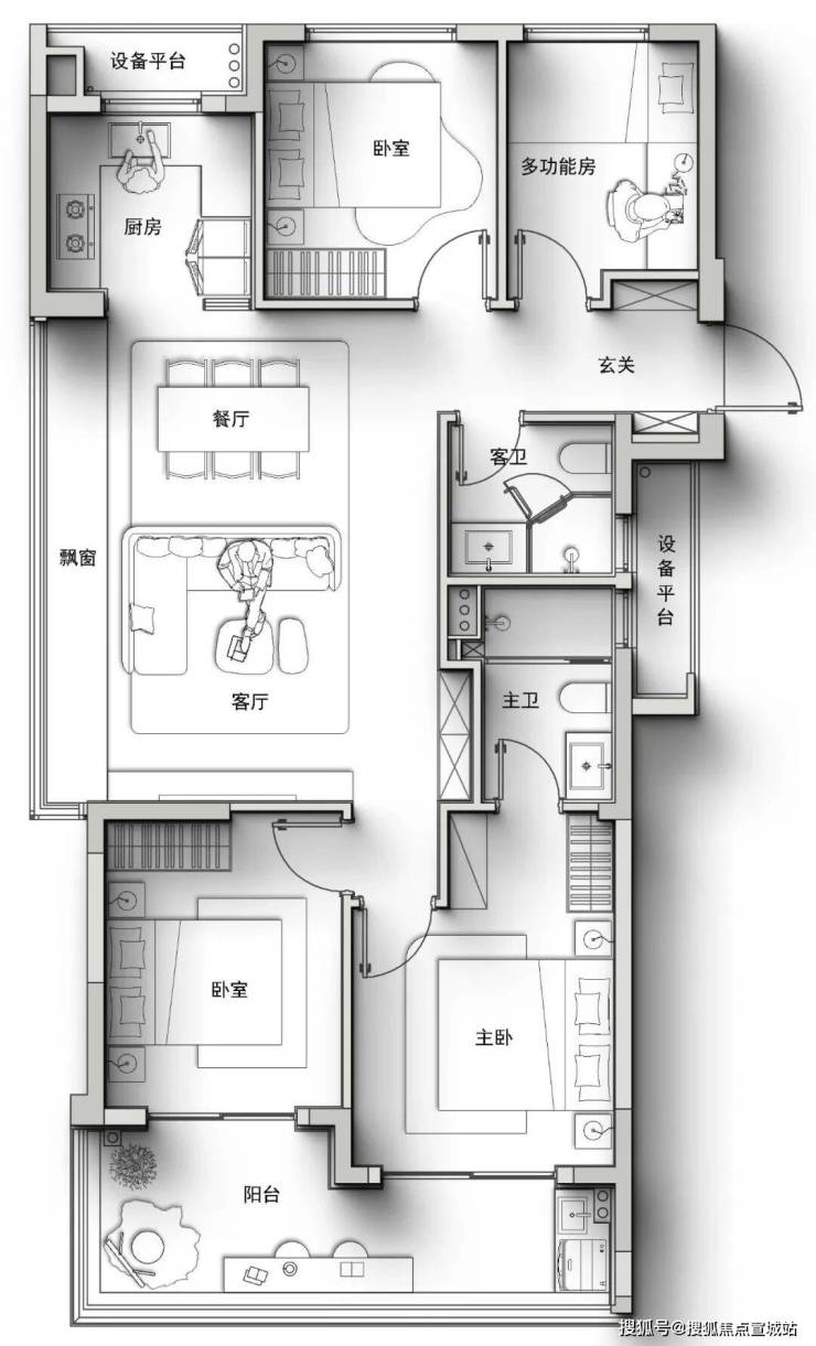 再看建面约117方四房户型,克制的面积实现四房两卫全功能之外,细节同样饱满,玄关双储物空间、双设备阳台、南向双联大阳台一应俱全。