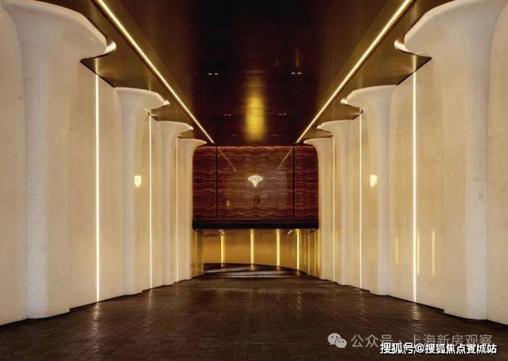 6、 社区含“奢材”量很高。门庭延街的外立面,以精工定制弧形 米色石材为主调,镶嵌典藏级 老虎玉大理石,点缀 古铜色现代海派艺术感灯器,整体呈现出百年海派的贵雅气质。