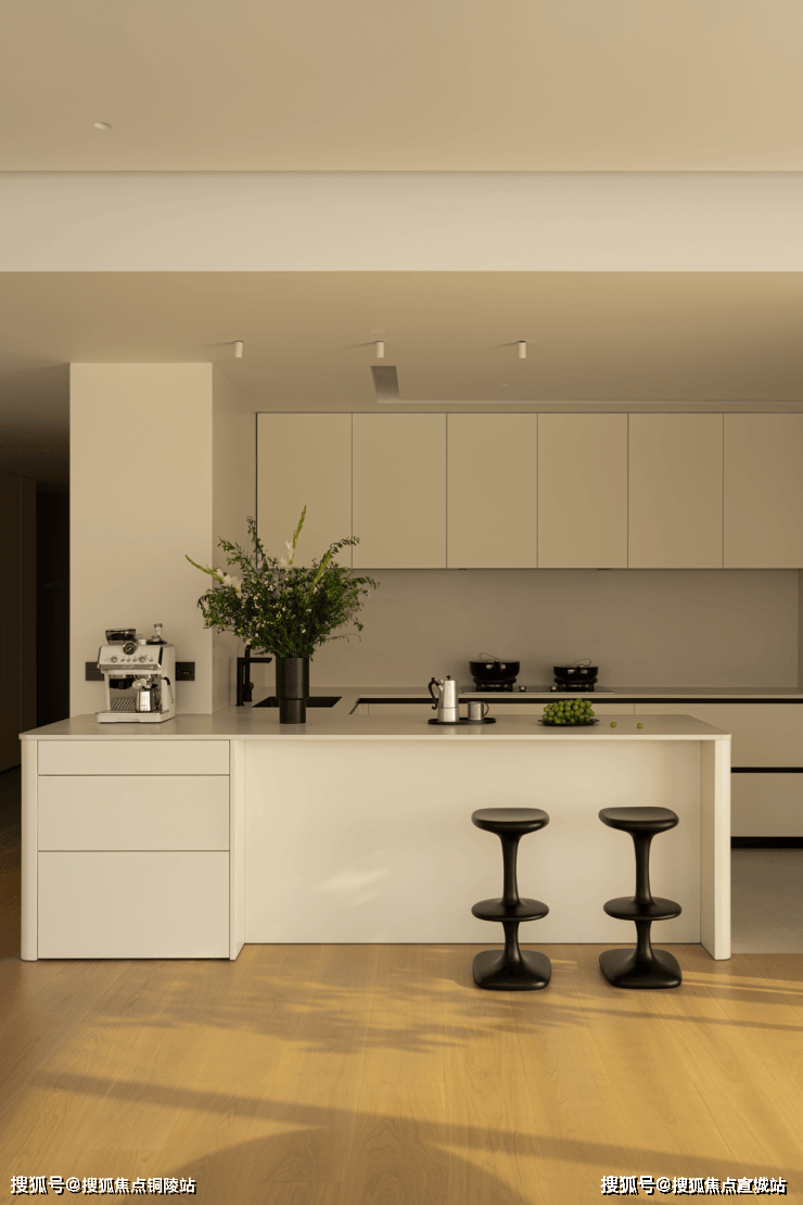 全开放式设计,岛形沙发打破边界,让交流随光影自由发生。午后的光线从侧面洒落,家具被赋予立体的光影层次。